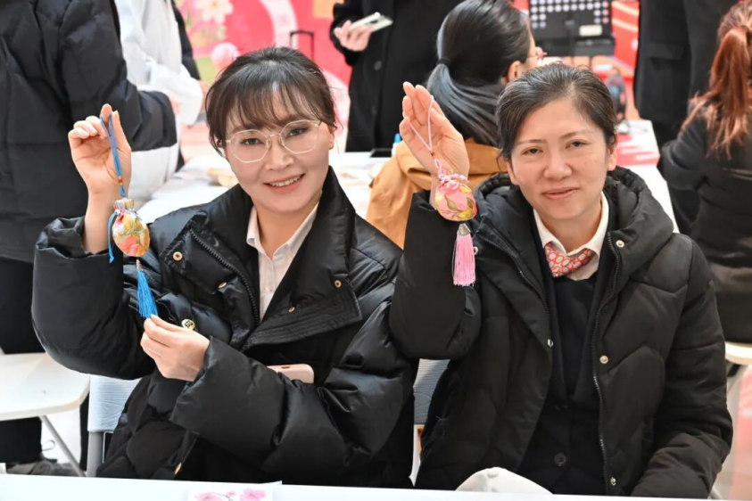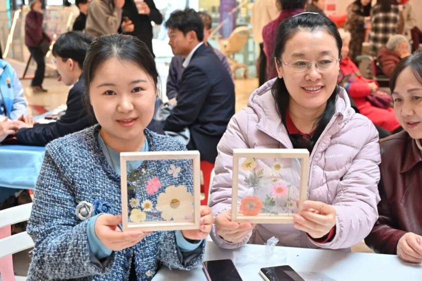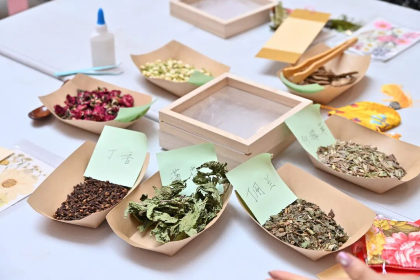 在手工DIY环节,大家围坐在一起,制作中药香囊和压花工艺品。学院志愿者细致讲解药材功效与制作技巧,女性朋友们发挥创意,将心意缝进香囊、将美好定格在压花作品中。