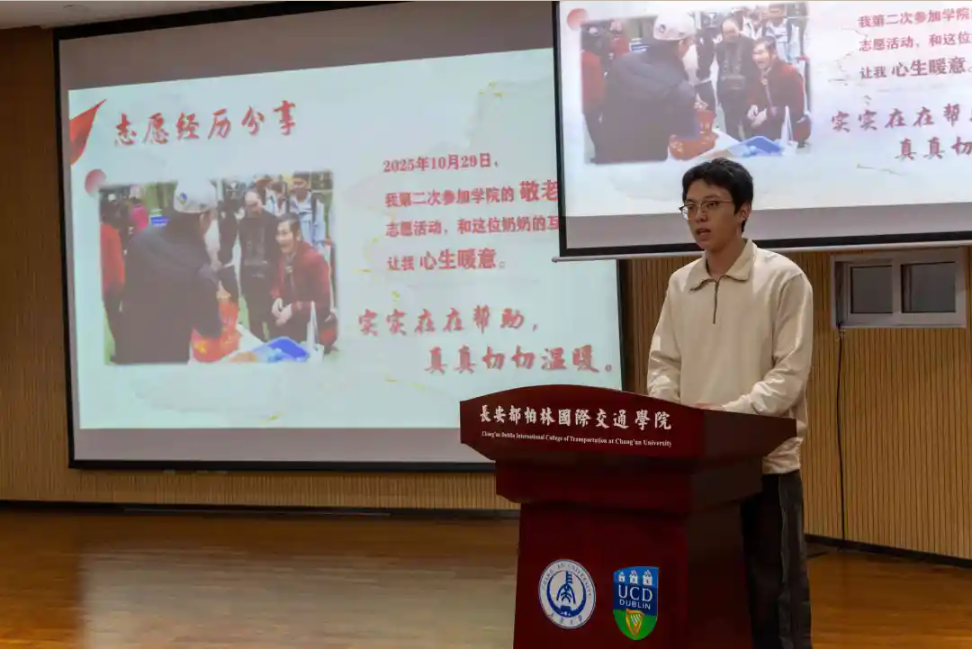 为深入学习贯彻党的二十届四中全会精神,全面落实习近平总书记对志愿服务工作的重要指示,大力弘扬“奉献、友爱、互助、进步”的志愿精神,进一步增强青年学生的社会责任感和服务意识,长安都柏林国际交通学院于12月4日晚在鸿远五层报告厅举办“国际志愿日”志愿故事主题分享活动。
