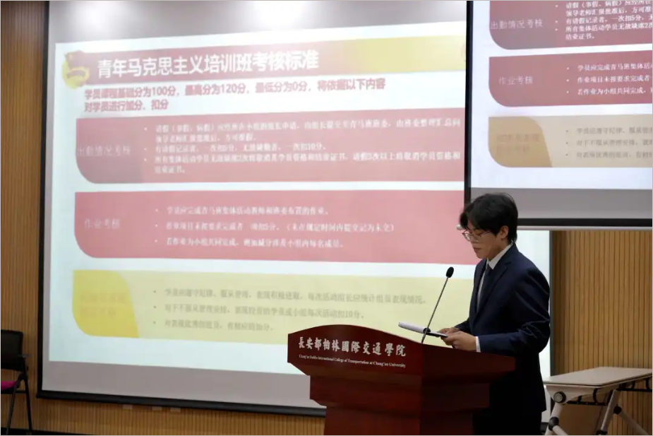 为深入学习贯彻习近平新时代中国特色社会主义思想,全面落实党的二十大和二十届四中全会精神,紧密围绕教育强国建设规划纲要部署要求,深化青年马克思主义者培养工程实效,11月13日晚,长安都柏林国际交通学院第六期青马班开班仪式暨第一次主题教育活动在鸿远教学楼五层报告厅举行。学院党总支副书记张艳萍,学生事务部全体成员,第五期青马班优秀学员代表及第六期青马班全体学员参加开班仪式,开班仪式由第六期青马班班长孟汉栩主持。